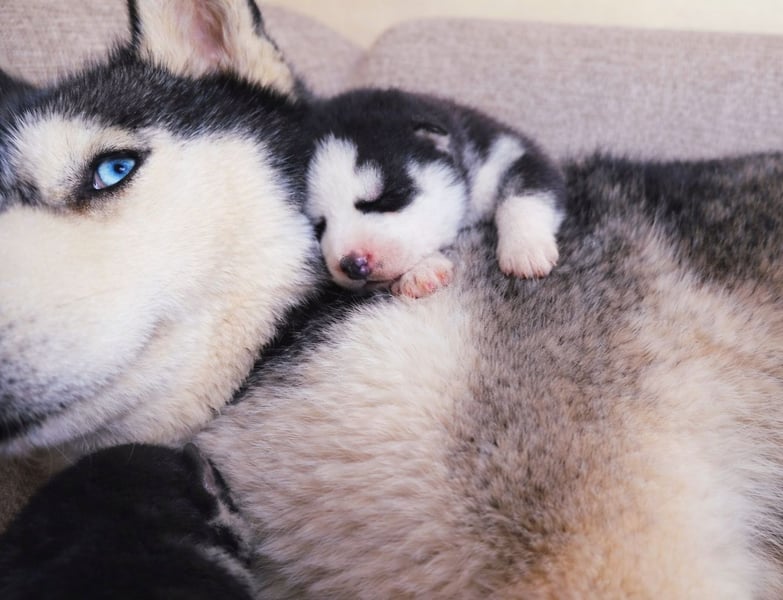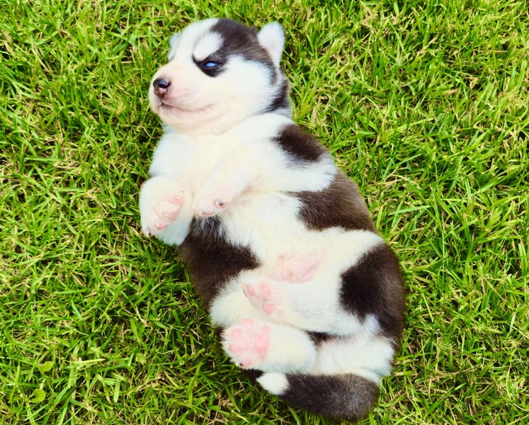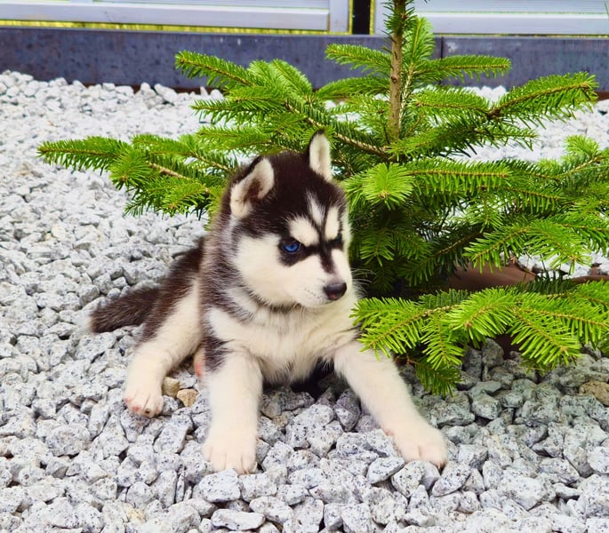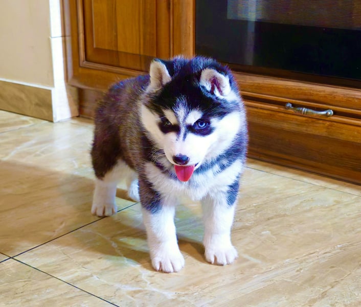 Schwarz-weißer Siberian Husky, blauäugiger Welpe mit FCI-Stammbaum