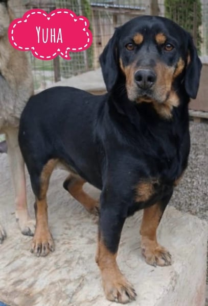 Yuha ist ein Mädchen, laut Tierarztschätzung ca. 2 Jahre alt (geb. 20.11.2023). Er ist mittelgroß, etwa kniehoch, und wiegt ungefähr 25 kg. Leider gibt es vor Ort keine Möglichkeit, ihn genau zu wiegen oder zu messen. Vermutet wird ein Slovensky Kopov / Dachsbracke Mischling.