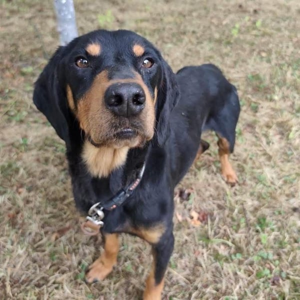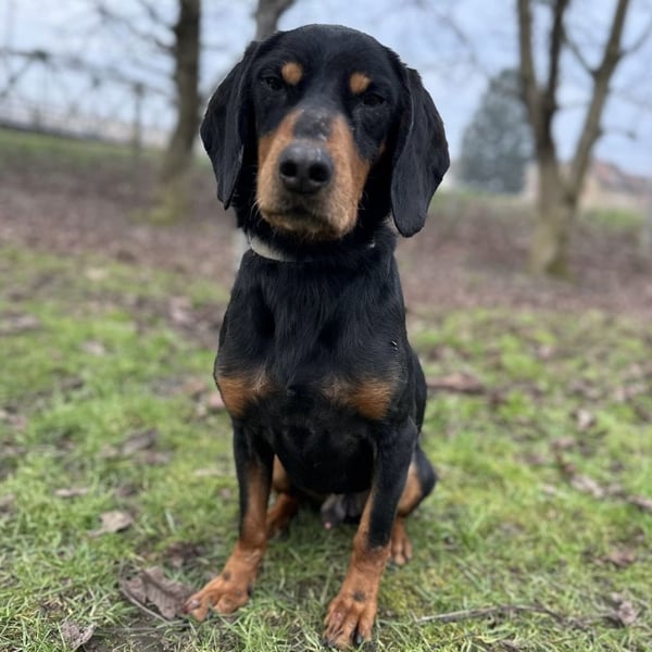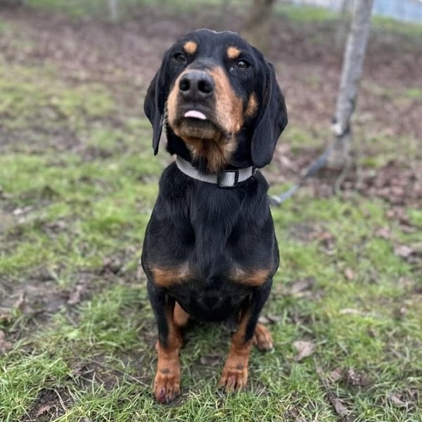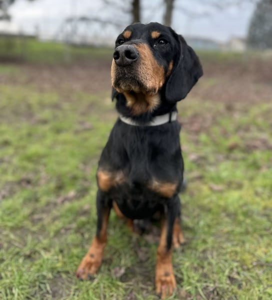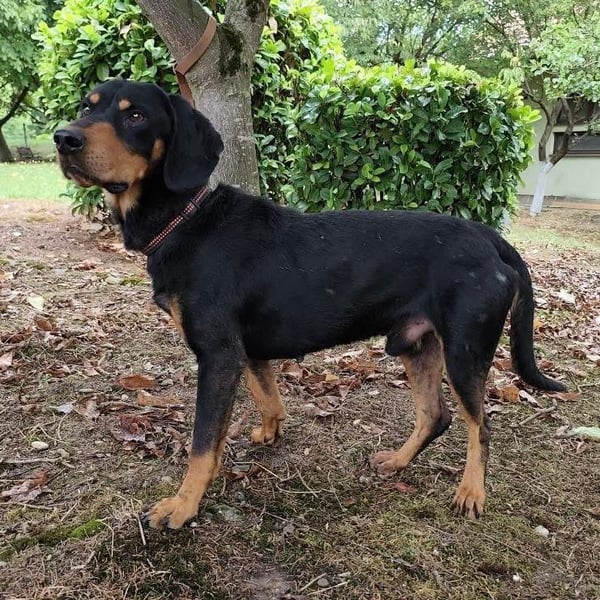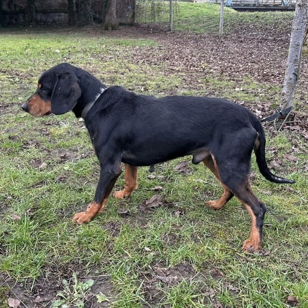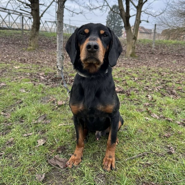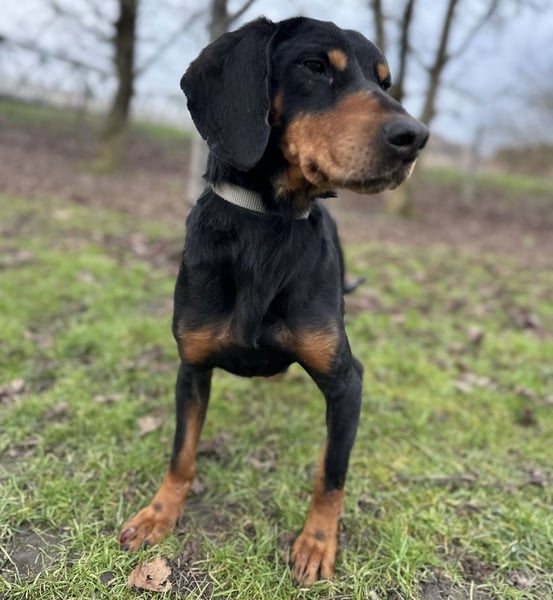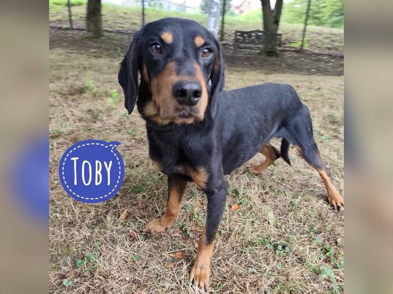 Toby ist ein lieber Rüde, laut Tierarztschätzung ca. 4,5 Jahre alt (geb. 03.06.2021). Er wiegt 19 kg und ist etwa 50 cm groß. Vermutet wird ein Slovensky Kopov.