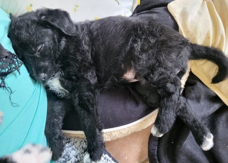 Mein Papa ist ein reinrassiger Perro de Agua und meine Mama eine Mischlingshündin die man nicht wirklich irgendeiner Rasse zuordnen kann.