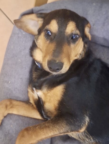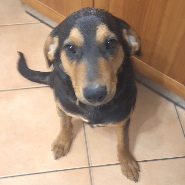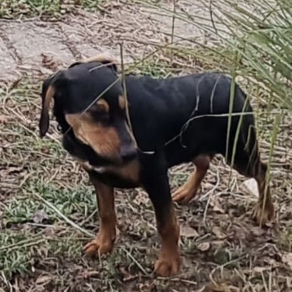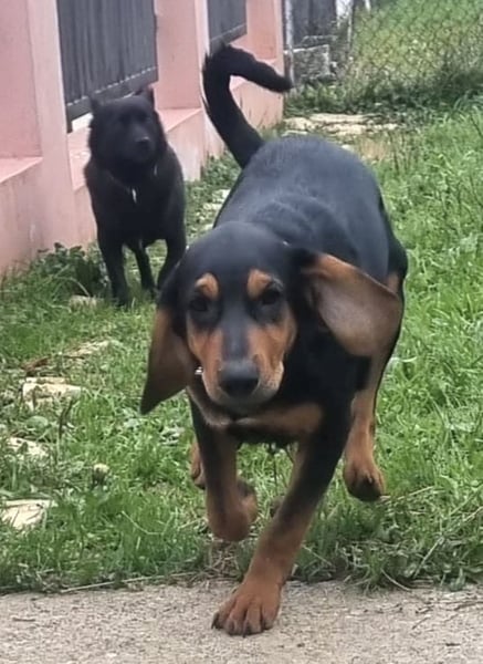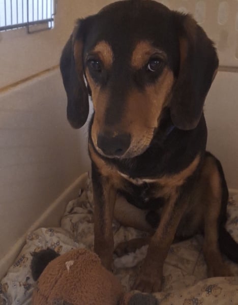 Don ist ein Bub, laut Tierarztschätzung ca. 7 Monate alt (geb. 20.06.2025), wiegt aktuell 16 kg und hat eine Rückenhöhe von 43 cm. Vermutet wird ein Beagle-Bracke Mischling.
