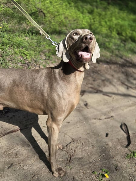 Typisch Weimaraner ist Füge intelligent, bewegungsfreudig und sowohl körperlich als auch geistig auslastungsbedürftig. Spielen – insbesondere mit dem Ball – liebt er sehr, wobei er manchmal noch etwas überdreht reagiert. Mit klarer Anleitung lernt er jedoch zunehmend, zur Ruhe zu kommen und sich besser zu regulieren. Seine Grobmotorik ist dabei weniger Ungehorsam als Ausdruck von Begeisterung und dem Wunsch nach Aufmerksamkeit.