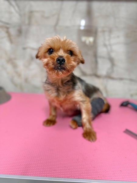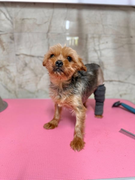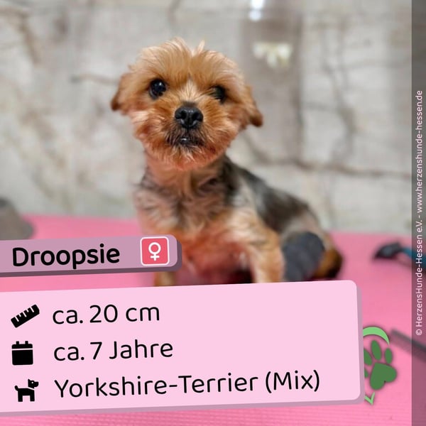 Droopsie ist eine etwa 4 kg leichte Yorkshire-Terrier-Mischlingshündin, ebenfalls aus der großen Welpenfabrik. Sie zeigt sich ruhig, freundlich und verträglich mit anderen Hunden. Ihr Wesen ist unterwürfig und unkompliziert.