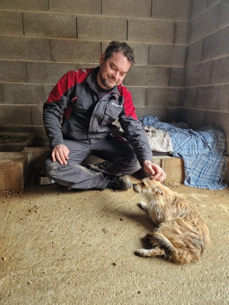 Er liebt es einfach so sehr gestreichelt zu werden und zu kuscheln, dass er sich immer öfter überwindet und vorsichtig auf die Männer im Tierheim zugeht.