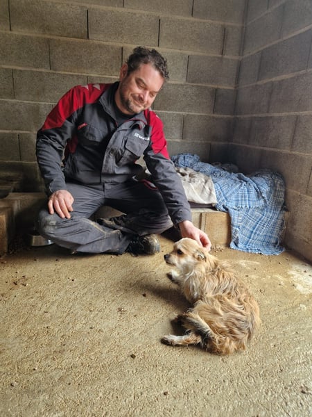 Er liebt es einfach so sehr gestreichelt zu werden und zu kuscheln, dass er sich immer öfter überwindet und vorsichtig auf die Männer im Tierheim zugeht.