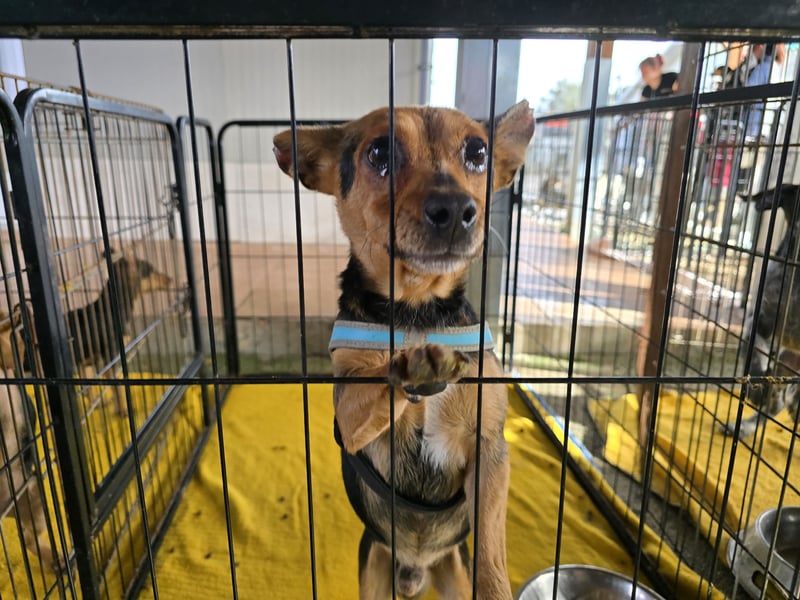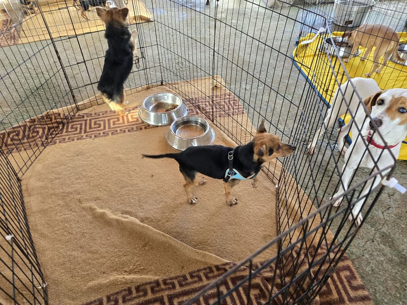 Roger wurde im September 2025 von der örtlichen Behörde beschlagnahmt. Anwohner hatten es gemeldet. Der kleine Kerl war an einer dicken Kette im Hinterhof angekettet, ein kleines Holzdach diente als Schutz und eine vollgekotete Decke war sein Schlafplatz.